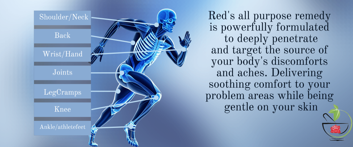 Red's All Purpose Remedy is designed for the purpose of helping you regain your strength by defeating pain. Our products have many components that include: Being able to penetrate layers to reach pain receptors, Cellular molecular healing properties which help your body to recover in a more timely manner, the penetrating action also helps with the conditioning of your joints and muscles. Arthritis, Aches, Gout, Sprains, Injuries, Skin conditions and even Bumps and Boils are trouble areas that have been reported as improved by our customers. This product is a true remedy and is already a staple in the homes of those that have tried it. With regular continuous use, you can see drastic changes in development of your conditions. Not only does it freeze the problem area, it gets down into it and begins a healing process. You'll see yourself functioning and feeling better in no time with Red's All Purpose Remedy.
