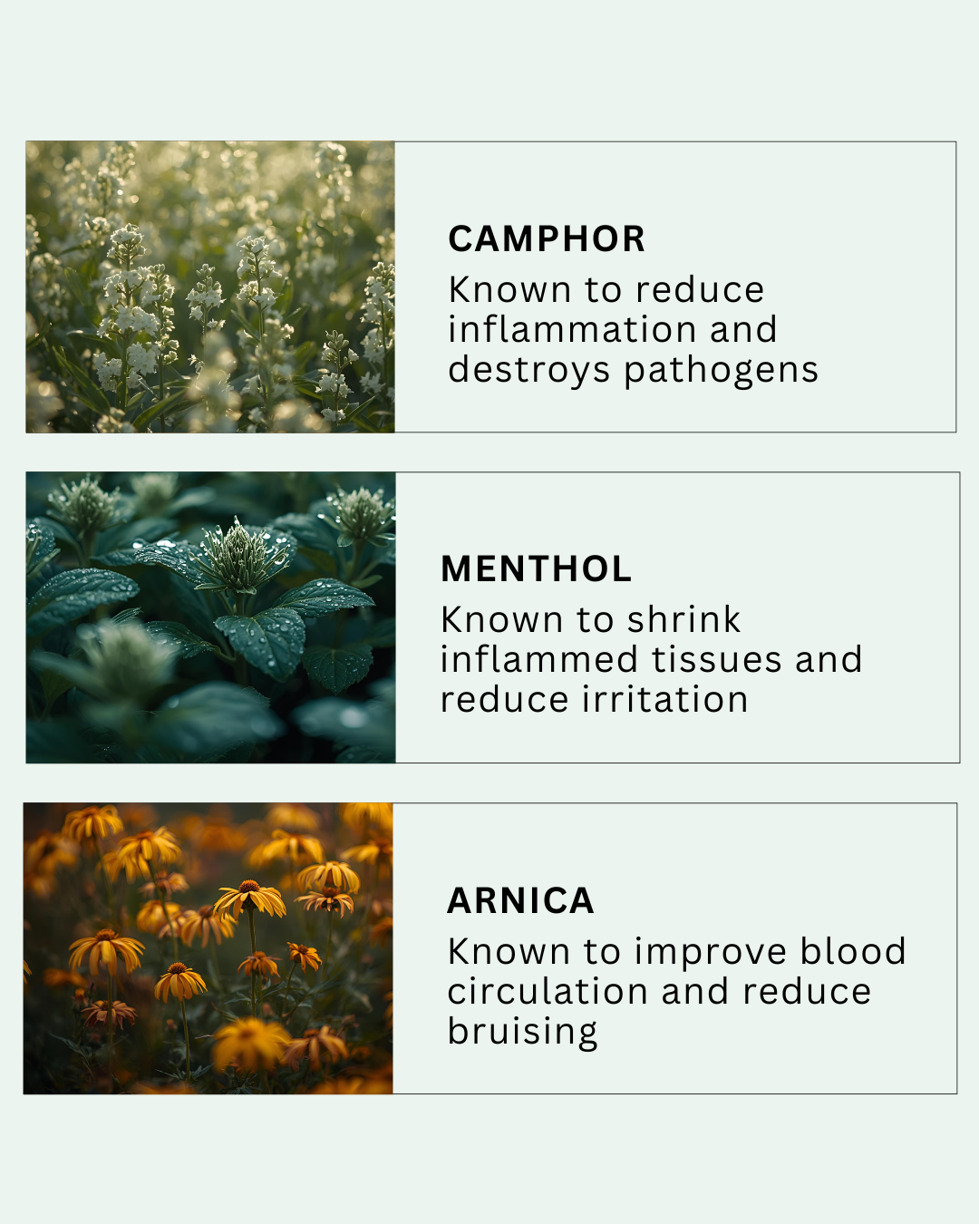 Camphor is a strong skin‑penetrating agent used topically to produce a cooling/warming effect, interrupt pain signals and increase local circulation.